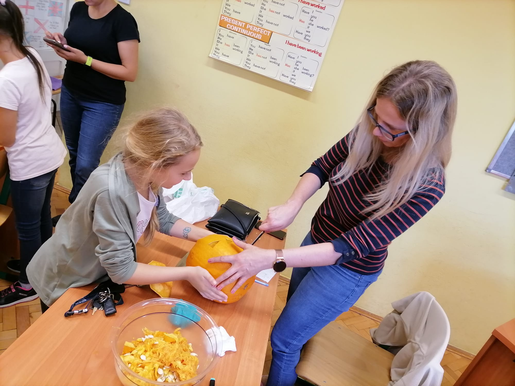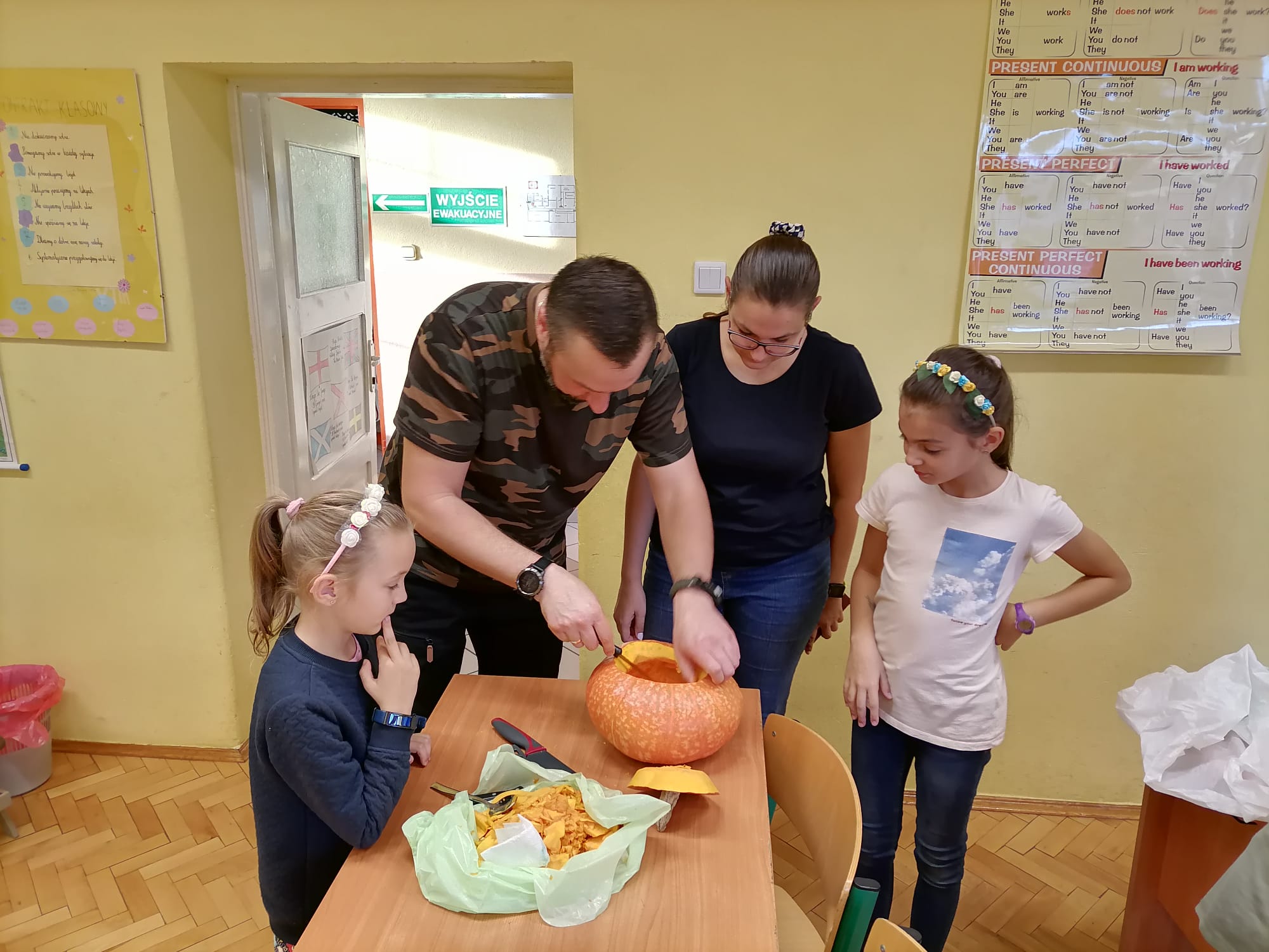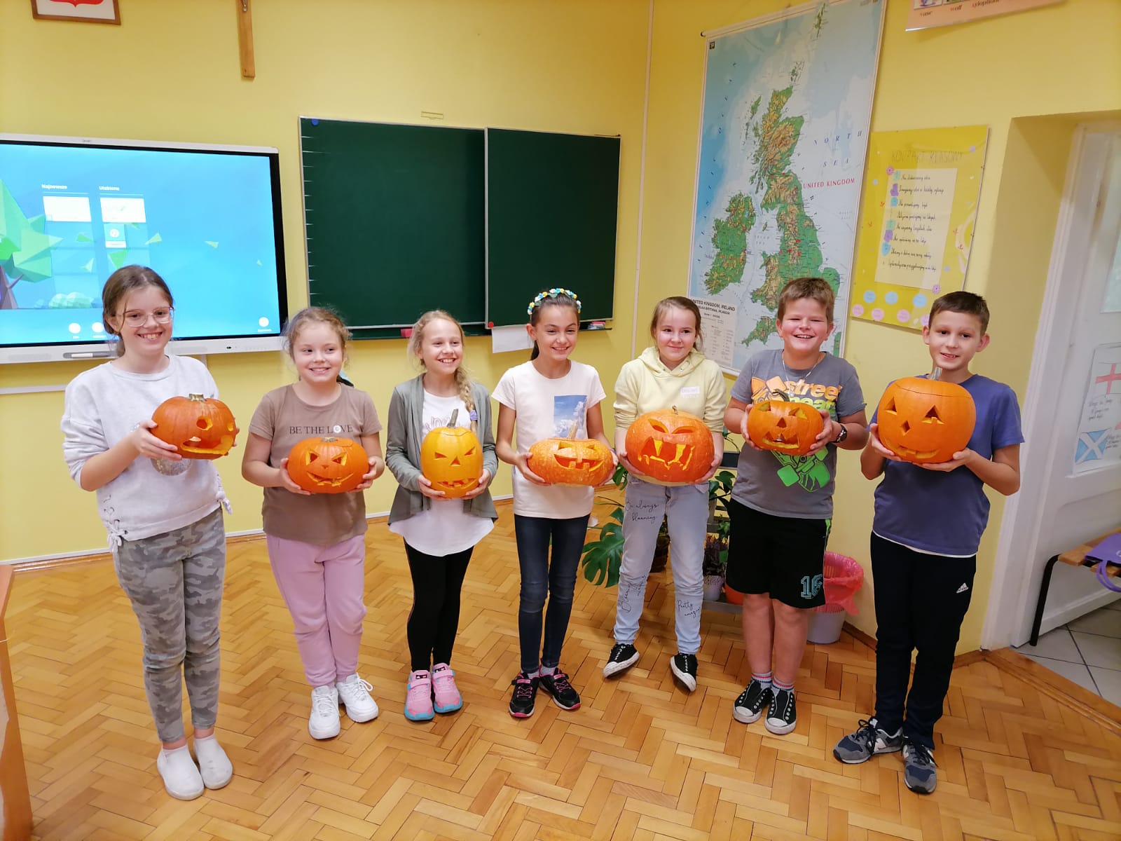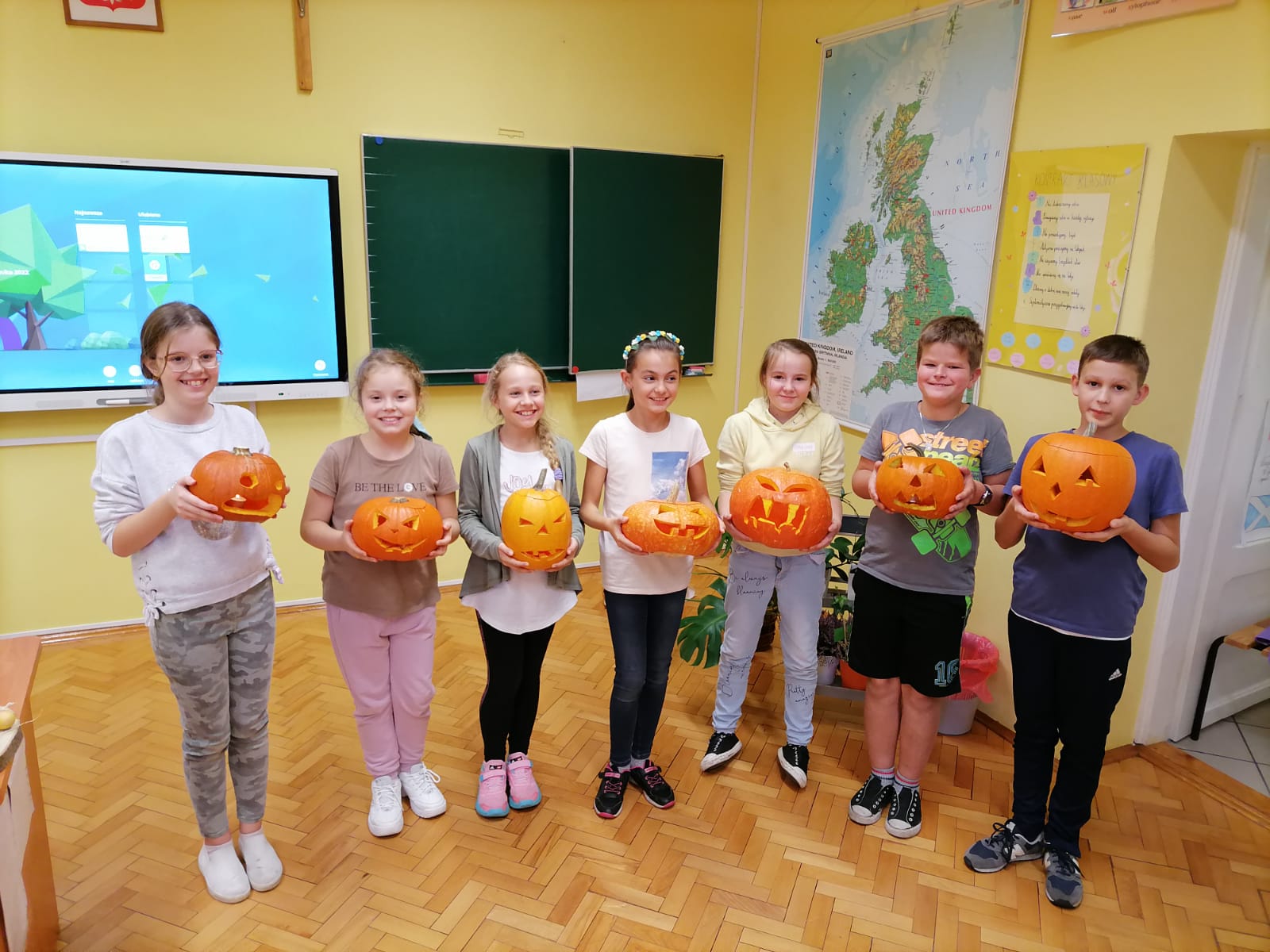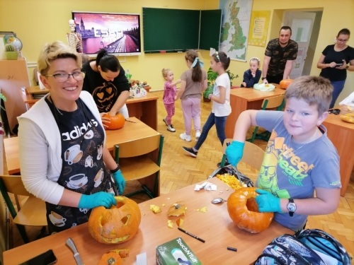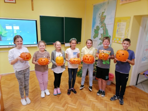 Wykonaliśmy własne Jack -o’- lanterns. Do pracy zaangażowaliśmy naszych rodziców, którzy okazali się nieocenioną pomocą. Czuwali nad posługiwaniem się ostrymi narzędziami, wspierali nasze pomysły, wycinali, drążyli, ale przede wszystkim świetnie się z nami bawili. Mieliśmy możliwość spędzić wspólnie październikowe popołudnie poznając tradycje krajów anglojęzycznych i utożsamiając się z nimi. Jesteśmy bogatsi o kolejne doświadczenie.  Efekty naszych prac eksponujemy na mini- wystawie, do której dołączyliśmy ozdoby wykonane długopisami 3d. Bardzo serdecznie dziękuję rodzicom moich uczniów, którzy poświęcili swój prywatny czas i pomogli w realizacji przedsięwzięcia.