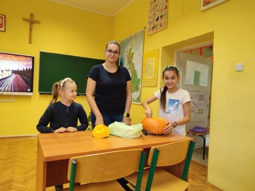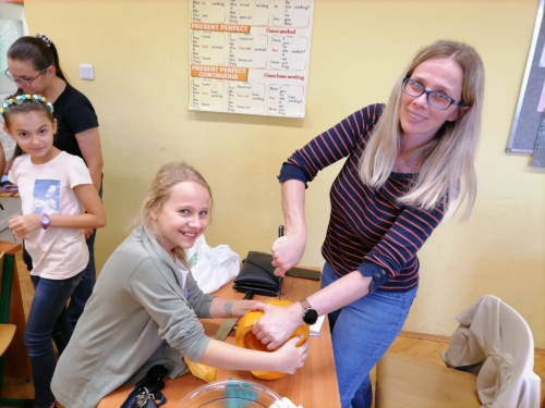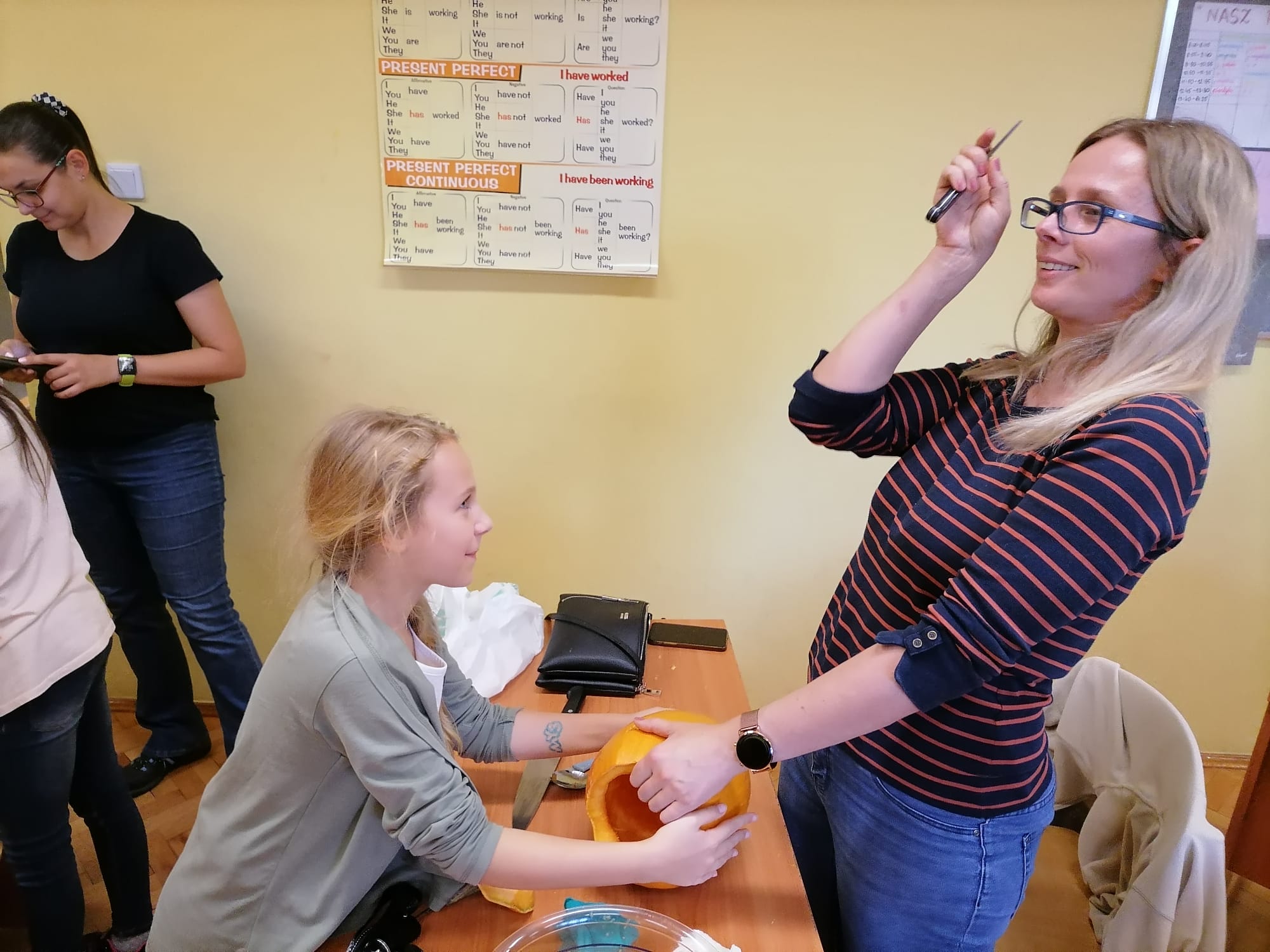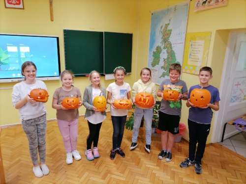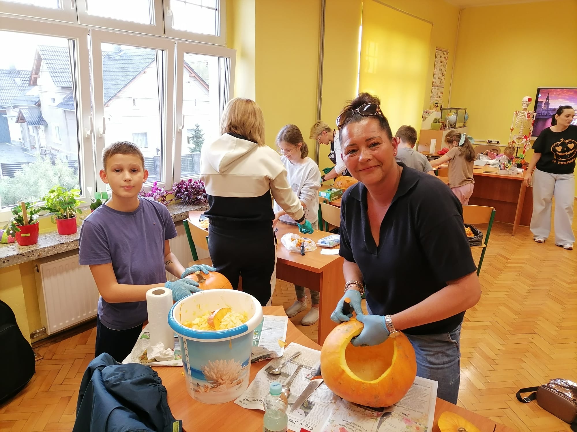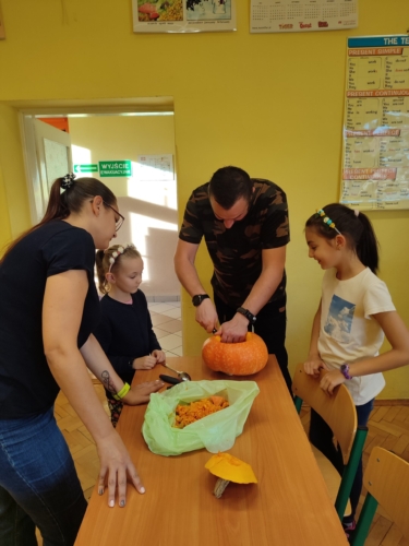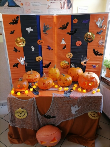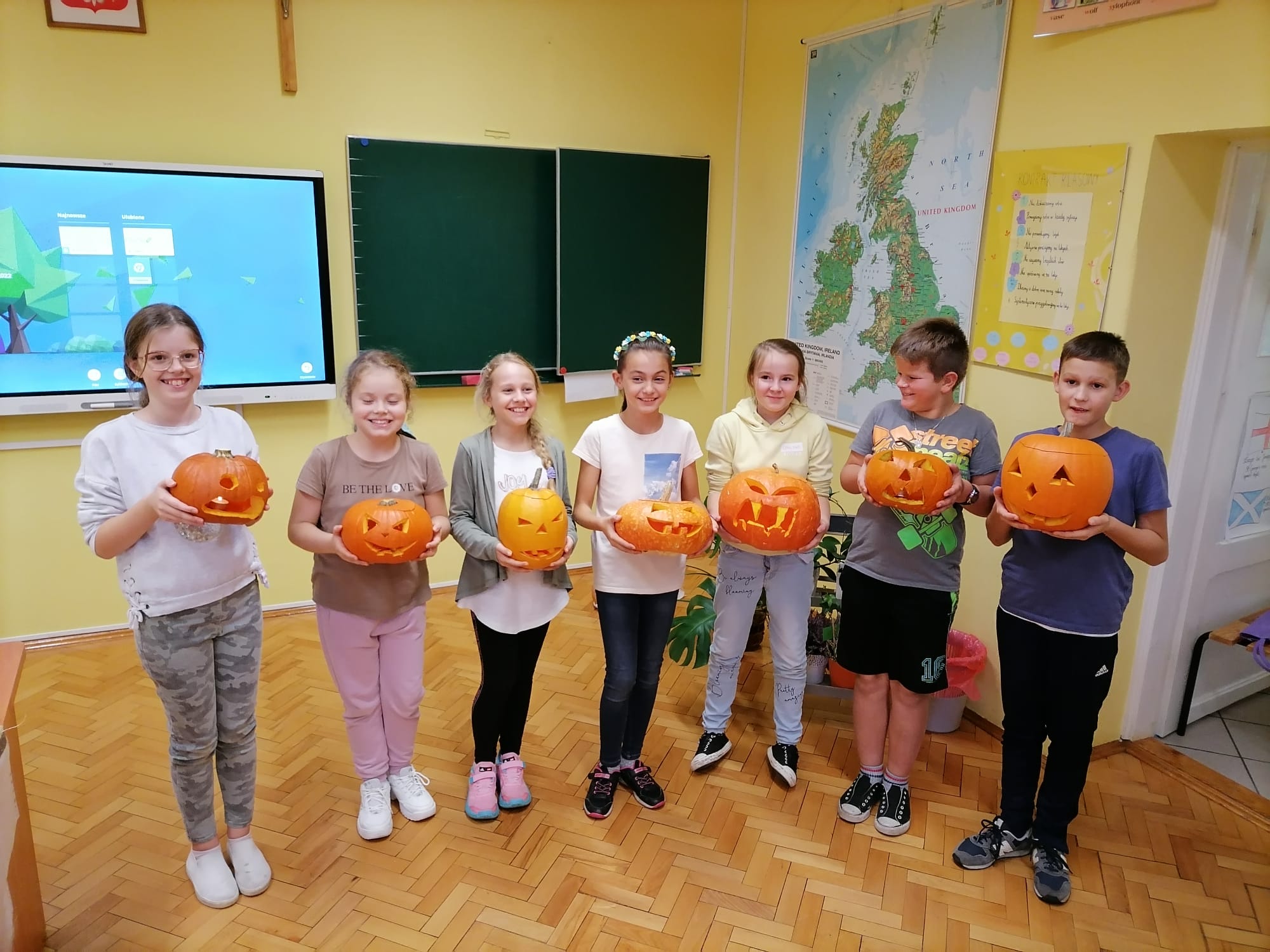 Wykonaliśmy własne Jack -o’- lanterns. Do pracy zaangażowaliśmy naszych rodziców, którzy okazali się nieocenioną pomocą. Czuwali nad posługiwaniem się ostrymi narzędziami, wspierali nasze pomysły, wycinali, drążyli, ale przede wszystkim świetnie się z nami bawili. Mieliśmy możliwość spędzić wspólnie październikowe popołudnie poznając tradycje krajów anglojęzycznych i utożsamiając się z nimi. Jesteśmy bogatsi o kolejne doświadczenie.  Efekty naszych prac eksponujemy na mini- wystawie, do której dołączyliśmy ozdoby wykonane długopisami 3d. Bardzo serdecznie dziękuję rodzicom moich uczniów, którzy poświęcili swój prywatny czas i pomogli w realizacji przedsięwzięcia.