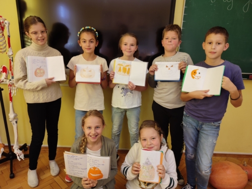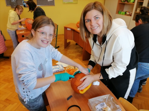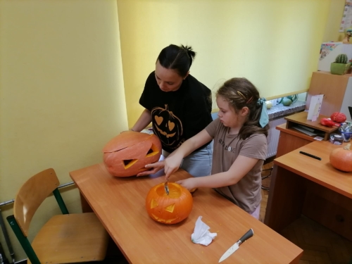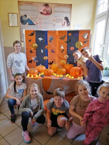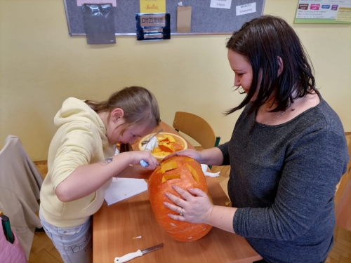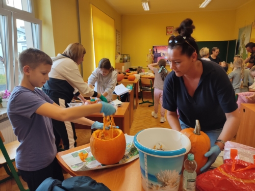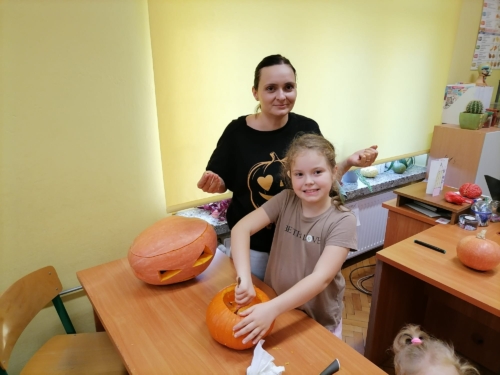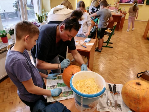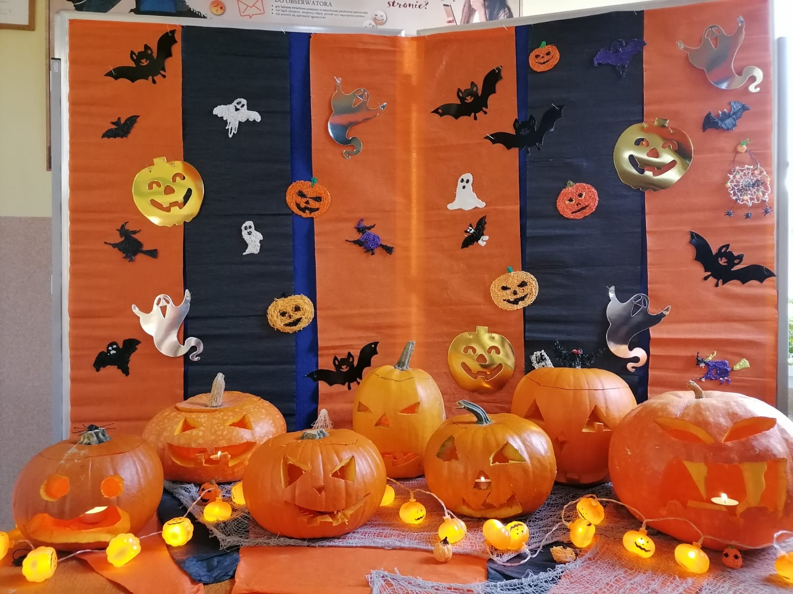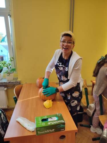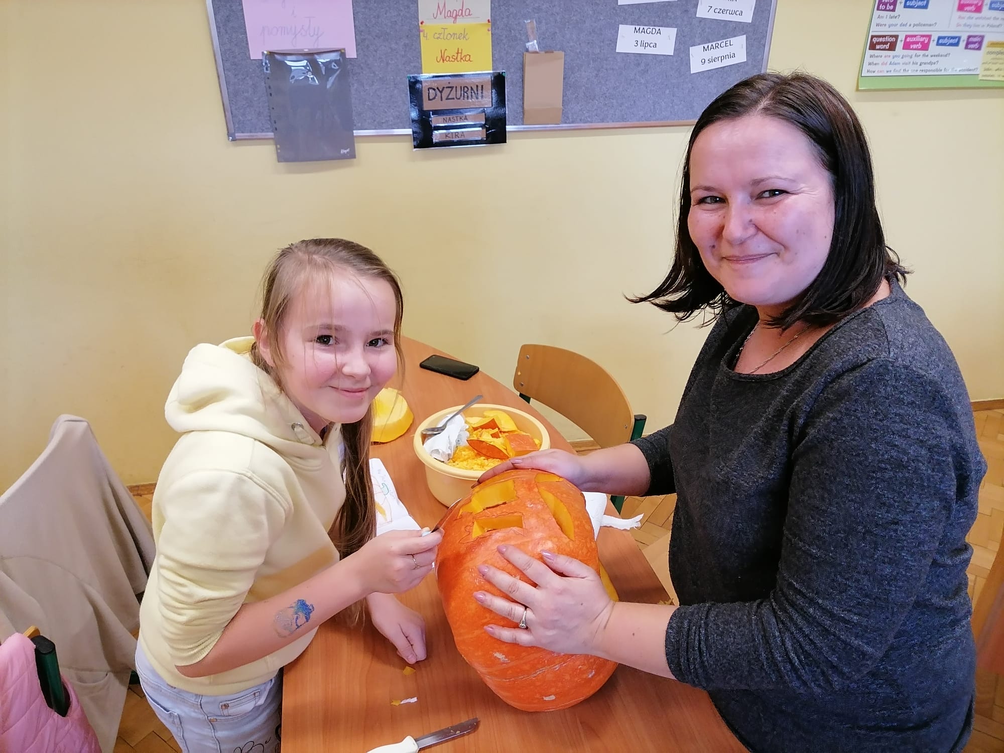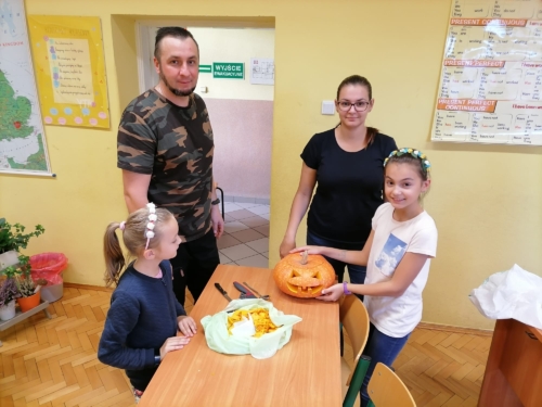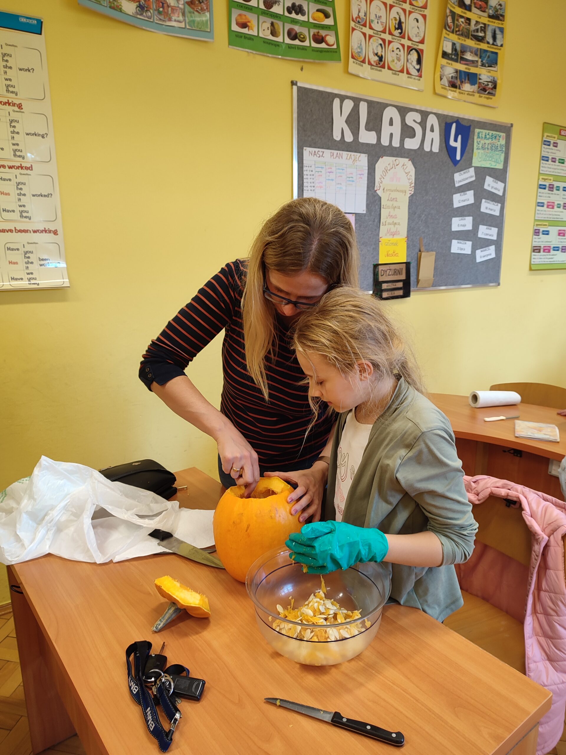 Wykonaliśmy własne Jack -o’- lanterns. Do pracy zaangażowaliśmy naszych rodziców, którzy okazali się nieocenioną pomocą. Czuwali nad posługiwaniem się ostrymi narzędziami, wspierali nasze pomysły, wycinali, drążyli, ale przede wszystkim świetnie się z nami bawili. Mieliśmy możliwość spędzić wspólnie październikowe popołudnie poznając tradycje krajów anglojęzycznych i utożsamiając się z nimi. Jesteśmy bogatsi o kolejne doświadczenie.  Efekty naszych prac eksponujemy na mini- wystawie, do której dołączyliśmy ozdoby wykonane długopisami 3d. Bardzo serdecznie dziękuję rodzicom moich uczniów, którzy poświęcili swój prywatny czas i pomogli w realizacji przedsięwzięcia.