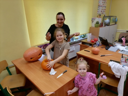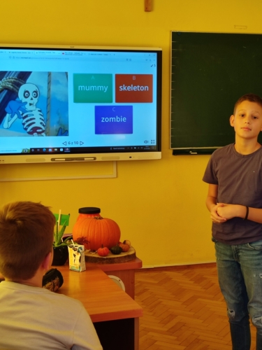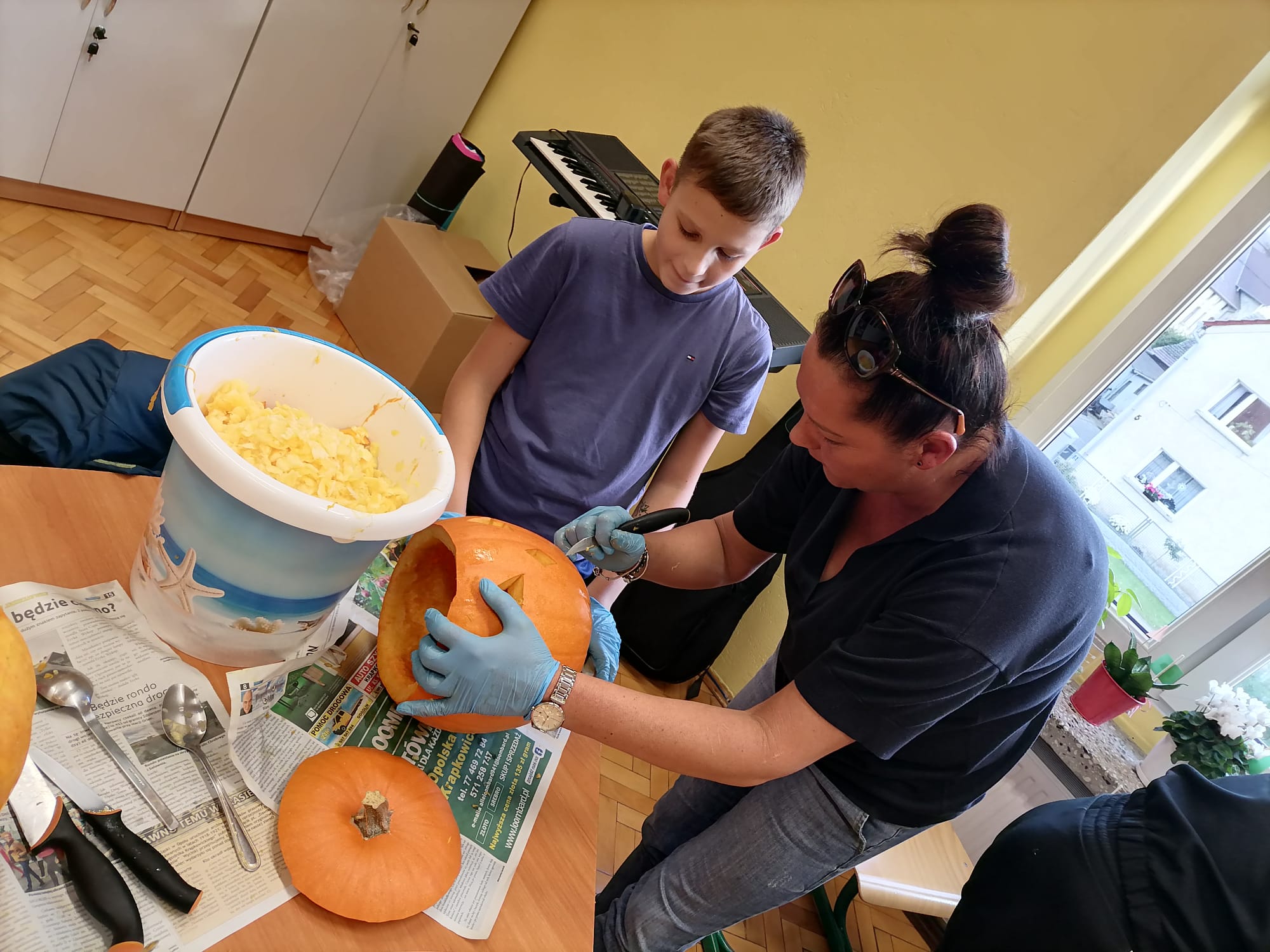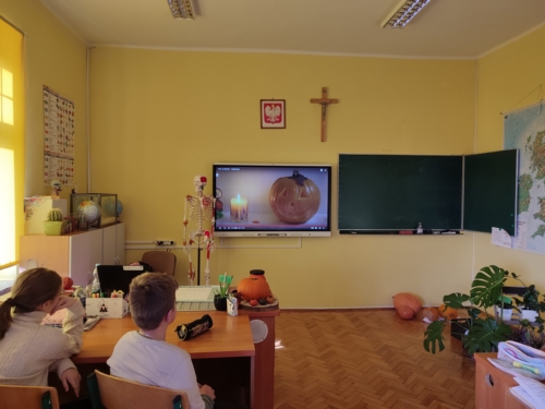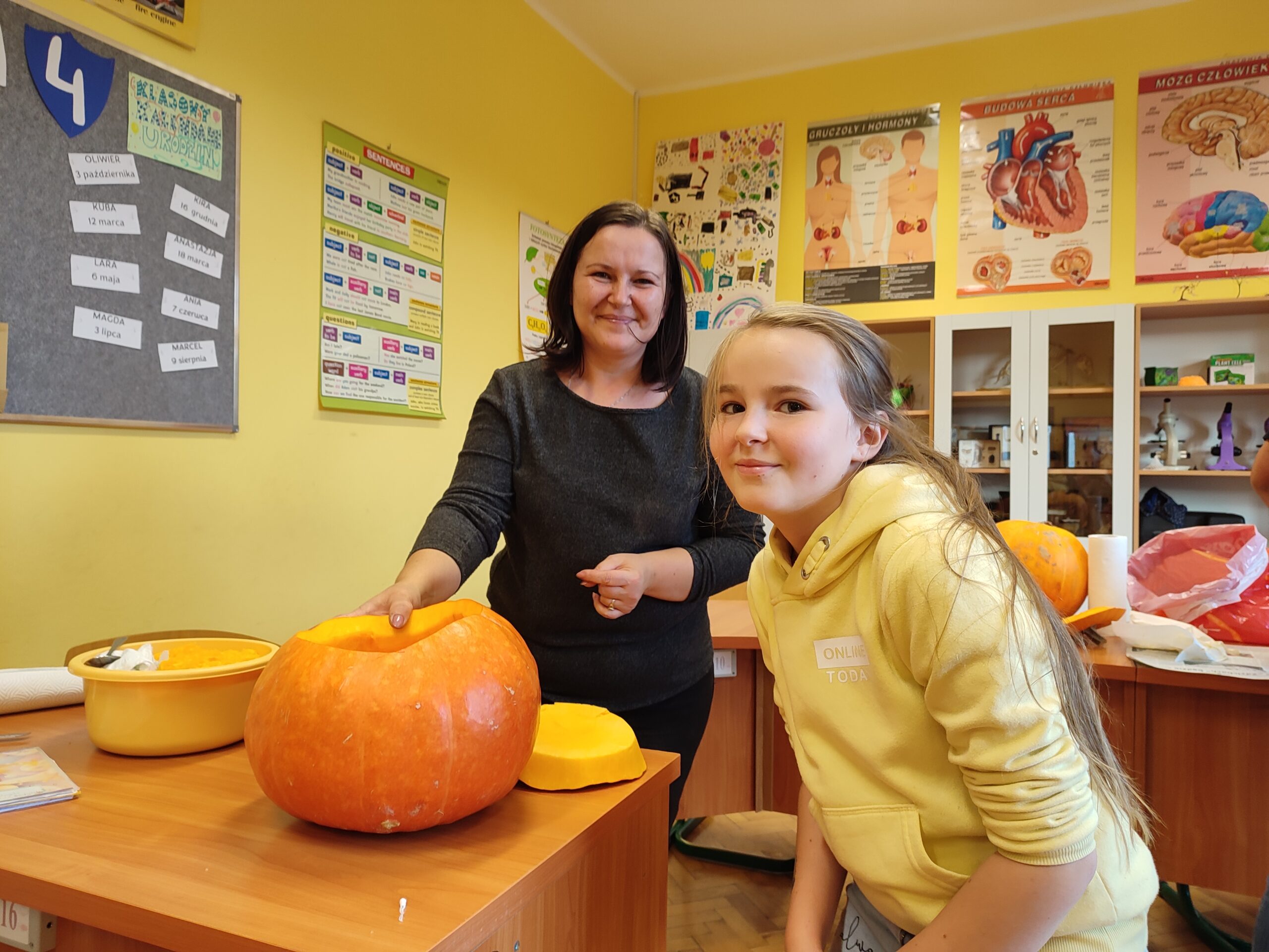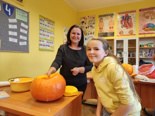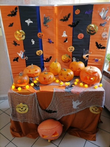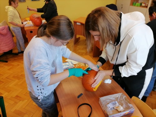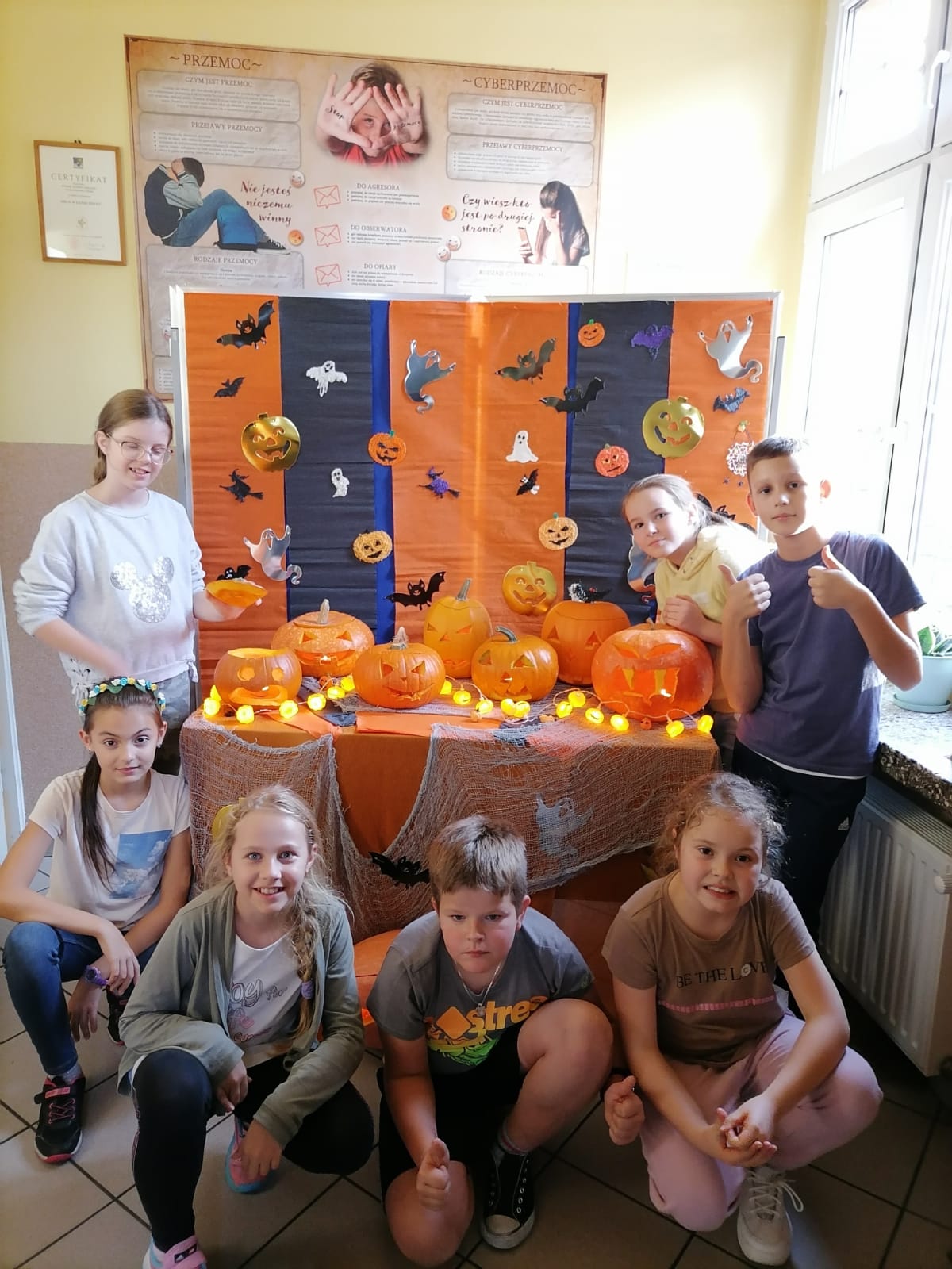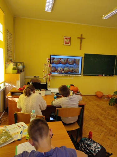 Wykonaliśmy własne Jack -o’- lanterns. Do pracy zaangażowaliśmy naszych rodziców, którzy okazali się nieocenioną pomocą. Czuwali nad posługiwaniem się ostrymi narzędziami, wspierali nasze pomysły, wycinali, drążyli, ale przede wszystkim świetnie się z nami bawili. Mieliśmy możliwość spędzić wspólnie październikowe popołudnie poznając tradycje krajów anglojęzycznych i utożsamiając się z nimi. Jesteśmy bogatsi o kolejne doświadczenie.  Efekty naszych prac eksponujemy na mini- wystawie, do której dołączyliśmy ozdoby wykonane długopisami 3d. Bardzo serdecznie dziękuję rodzicom moich uczniów, którzy poświęcili swój prywatny czas i pomogli w realizacji przedsięwzięcia.
